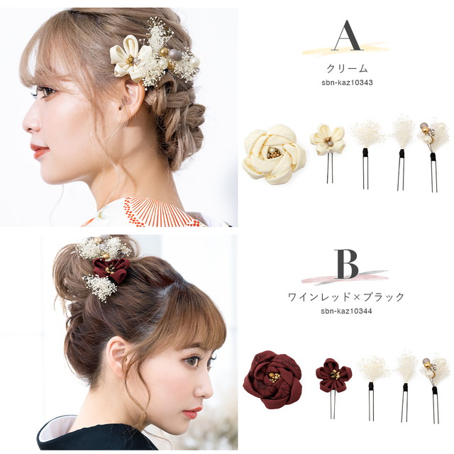卒業式 髪飾り かすみ草 つまみ細工 レース 袴 成人式 振袖 5点 セット クリーム 赤 灰色 黒 ベージュ 花 フラワー コサージュ 髪留め ヘアアクセサリー 送料無料