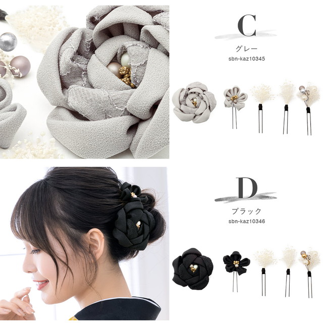 髪飾りはUピン式とクリップ式ですので、着物に合わせ自由な組み合わせでご使用いただけます。