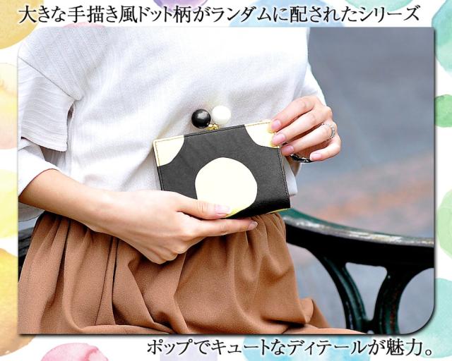 くっきりと大胆に描かれたランダムドットがちょっぴりレトロで温かみを感じさせる、愛らしいデザインの二つ折り財布です。