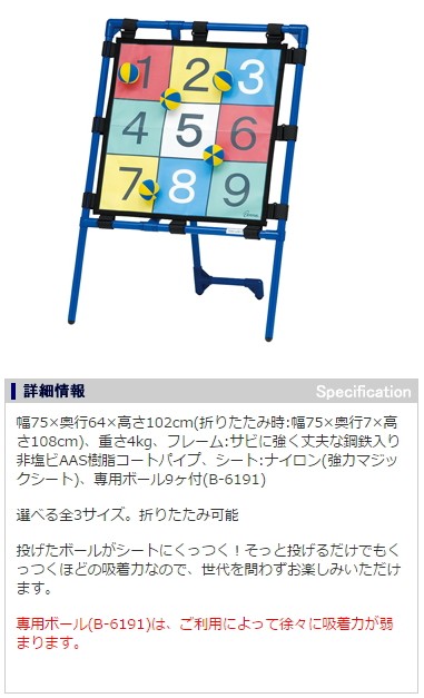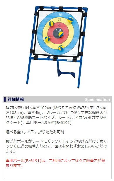 【送料について】北海道、沖縄、離島は別途送料を頂きます。ターゲットゲーム60ゲーム種類:ターゲット・ストライク・ダーツ3種類のゲームの中から、1種類お選びください。サイズ:幅75x奥行64x高さ102cmシート:60x60cm折りたたみ時:幅75x奥行7x高さ108cm重さ:4kg材質:フレーム:鋼鉄入非塩ビAAS樹脂コートパイプ・シート:ナイロン(強力マジックシート付属品:専用ボール9ヶ(ご利用によって徐々に吸着力が弱まります)※お支払いは、クレジットカード又はコンビニ後払い決済にてお願いいたします。※別途送料が発生する場合は、当店よりご連絡致します。