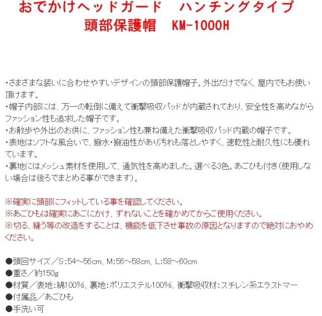【送料について】北海道、沖縄、離島は別途送料を頂きます。キヨタ(株)頭部保護帽おでかけヘッドガード ハンチングタイプKM-1000Hカラー:ベージュ・アイボリー・ブラックサイズ:S・M・L重さ:150g男女共用材質/表地:綿100% 裏地:ポリエステル100%衝撃吸収材」スチレン系エラストマー生産国:中国