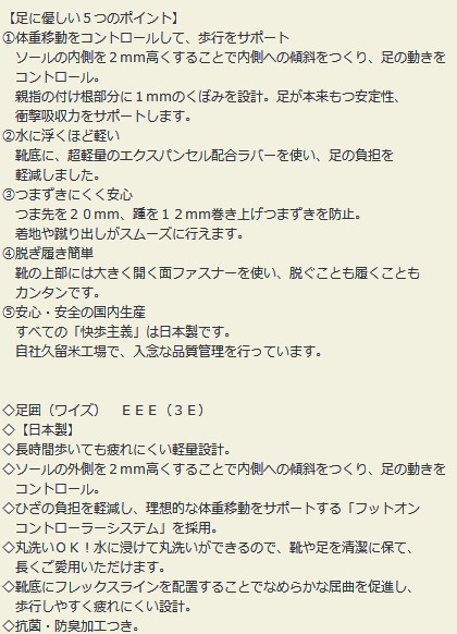 【送料について】北海道、沖縄、離島は別途送料を頂きます。NEW 快歩主義L011 おしゃれな新色登場!軽くて、つまずきにくく、脱ぎ履きラクラクです!◆超軽量、ゆったり幅広3Eサイズ。毎日のおでかけが楽しくなります。とにかく軽い!脱ぎ履きがラク*靴の上部には、大きく開くマジックテープを使っているため、脱ぐことも履くこともカンタンです。つまずきにくい*つま先を20mm、踵を12mm巻上げて、つまずきを防止。*つまずきにくく歩きやすい安心設計になっています。*着地や蹴り出しがスムーズに行えます。 *足サイズの確認をおねがいします。サイズ:21.5〜25.0cm(0.5cmきざみ)ワイズ(足囲):3E素材:/マテリアル:ポリエステル・PU・ナイロン・合成繊維 ソール:ラバー重量:165g(23.0cm片足分)サイズ/21.5〜25.0cm(0.5cmきざみ)、ヒール外寸:約2.5cm生産国/日本