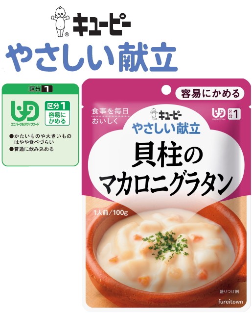 介護食 キューピー やさしい献立 貝柱のマカロニグラタン 100g ほんのりチーズをきかせたホワイトソースに貝柱、マカロニ、じゃがいもを加えたグラタンです。 区分1 容易にかめる おかず