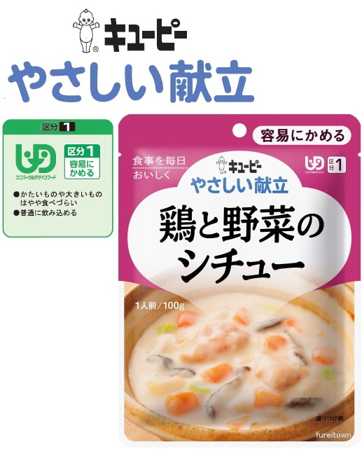 介護食 キューピー やさしい献立 鶏と野菜のシチュー 100g 鶏肉を玉ねぎ、キャベツ、にんじん、しいたけとじっくり煮込んだシチューです。 区分1 容易にかめる おかず
