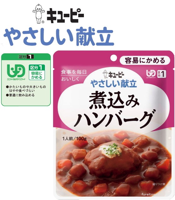 介護食 キューピー やさしい献立 煮込みハンバーグ 100g ハンバーグをコクのあるソースでじっくり煮込みました。介護食,やわらか食,レトルト,調理済具材の形を残し、スプーンなどでかんたんにつぶせるくらいにやわらかく調理しています。 区分1 容易にかめる おかず