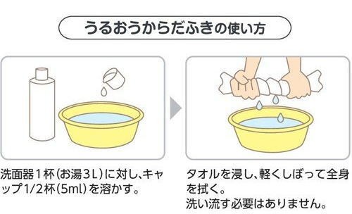 【送料について】北海道、沖縄、離島は別途送料を頂きます。・拭くだけでらくに汚れを落とし、きちんと保湿もできます。・お湯に溶かして拭くだけ。・おしり・陰部洗浄にも使えます。使用方法1、洗面器1杯(約3L)のお湯に清拭料を約5ml(キャップ約1/2杯)とかしてください。2、タオル等を浸し軽くしぼって全身をふいてください。洗い流す必要はありません。「ご注意」ご使用後は、キャップの水気を清潔な布等でふいてからお閉めください。誤飲防止のため、保管場所には十分ご注意ください。使用上の注意●あせも、傷、はれもの、湿しん等、異常のある時はお使いにならないでください。●使用中、または使用後に、刺激等の異常があらわれた時は使用を中止し、皮フ科専門医等へのご相談をおすすめします。●目に入らないようにご注意ください。目に入った時はきれいな水ですぐに洗い流してください。●乳幼児の手の届かないところに保管してください。