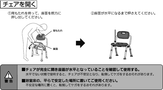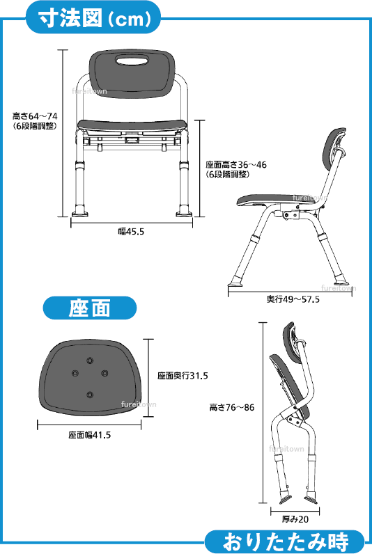 | 付加機能 | ・やわらかクッション。お尻がやせている方にも座り心地がやさしい、やわらかいクッション。取り外せるのでお手入れも簡単です。部品購入も可能です。 ・折りたたみ時の奥行約20cm。自立型で収納がらく。 ・シャワーチェア防カビタイプ“ユクリア”シリーズ。 防カビ加工によりカビの発生を抑えます。 SIAA(抗菌製品技術協議会)防カビ加工マーク取得。 |
