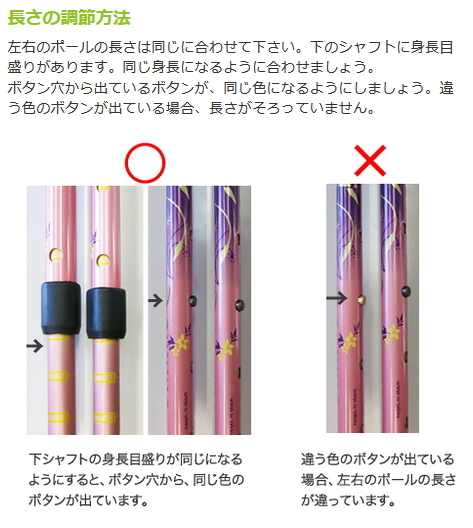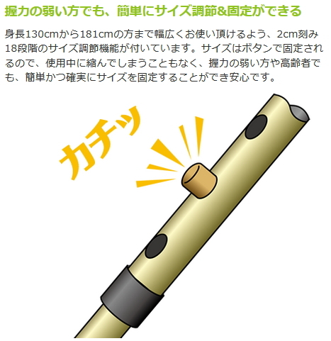 | 商品の仕様 ●サイズ/長さ80〜114cm(18段階/2cm)、グリップ:5×4cm、収納時:80cm ●パイプ径/上部:1.6cm、下部:1.4cm ●サイズ(身長)/127〜181cm ●重さ/215g(1本) ●材質/本体:アルミ、グリップ:エラストマー ●生産国/日本 ●SGマーク取得商品 ![]() |
