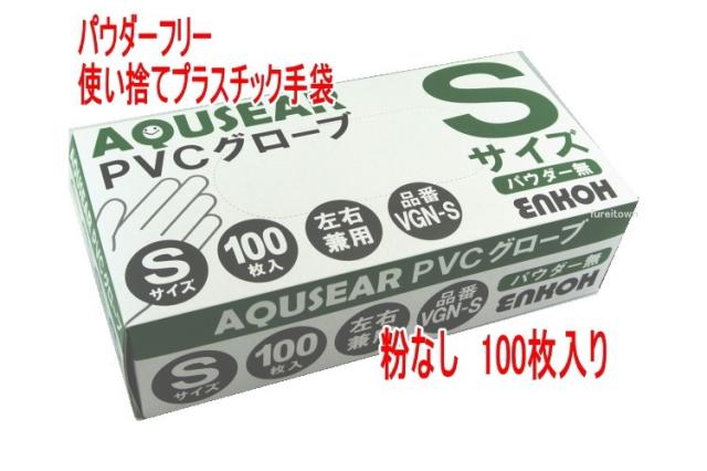 【送料について】北海道、沖縄、離島は別途送料を頂きます。【介護用手袋】【ディスポグローブ】【プラスチック手袋】パウダーフリー加工。手にぴったりフィットする超薄手仕上げです。素手感覚でお使いいただけます。便利な左右兼用タイプのため無駄なくお使いいただけます。100枚/箱プラスチックグローブ AQUSEAR PVC グローブ パウダーフリー 100枚入り色 クリアVGN-S Sサイズ 100枚入り株式会社 遠興全長 230mm 以上手のひら周り 170mm+-2mm中指の長さ 72mm+-3mm*サイズの確認をおねがいします。材 質 PVC(ポリ塩化ビニル)生産国 中国*この商品は衛生用品のため返品交換不可となっております。ご協力お願いいたします。