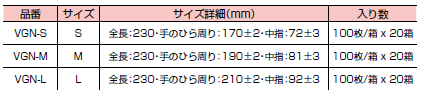 | 中指の長さ | 72mm +-3 | 81mm +-3 | 92mm +-3 |