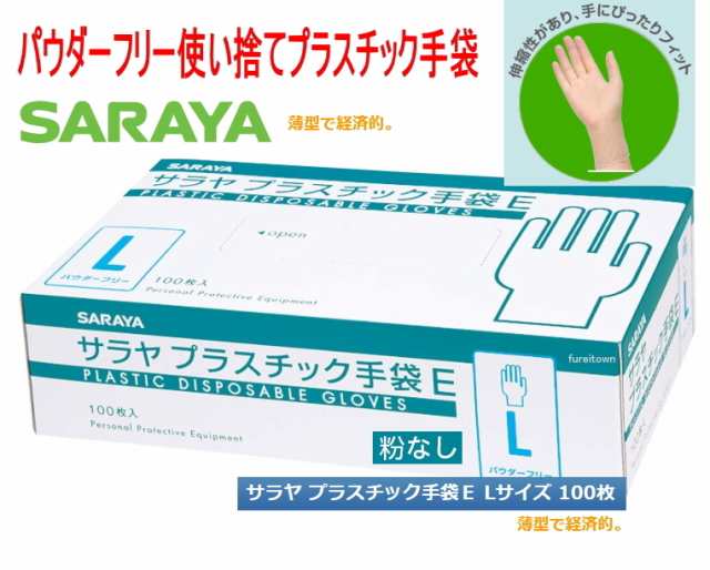 サラヤ プラスチック手袋E(粉なし) Lサイズ 100枚入り/箱 パウダーフリー プラスチックグローブ PVCグローブ 介護 ディスポ使い捨て手袋
