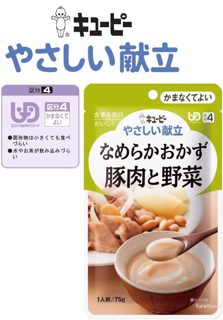 介護食 キユーピー なめらかおかず豚肉と野菜 75g やさしい献立 豚肉と玉ねぎをじっくりと炒め、じゃがいも、大豆と一緒になめらかに裏ごししました。介護食,やわらか食,レトルト,調理済 区分4 かまなくてよい