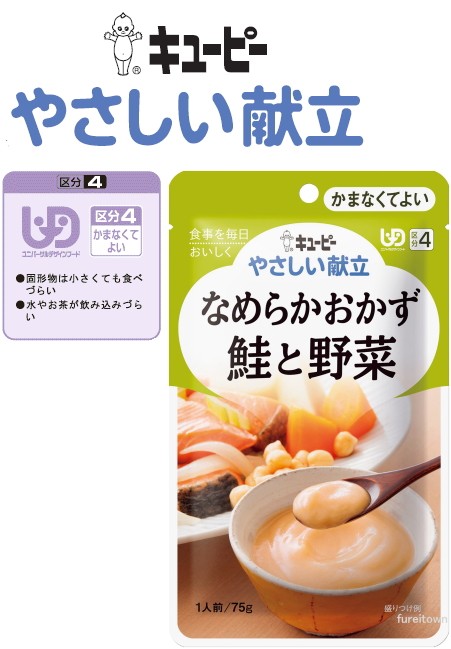 介護食 キユーピー なめらかおかず 鮭と野菜 75g やさしい献立 鮭、玉ねぎ、セロリをじっくりと炒めて素材のおいしさをひきだしました 介護食,やわらか食,レトルト,調理済 区分4 かまなくてよい