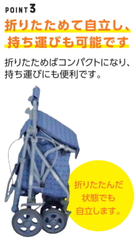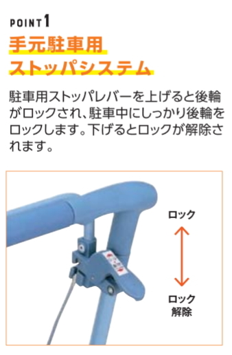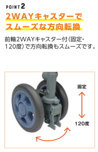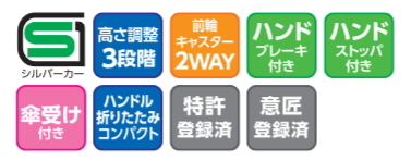 | ●標準機能/ 折りたたみ、2WAYキャスター(左右60°・固定)、手元ブレーキ、駐車ブレーキ、座面、杖・傘立て |