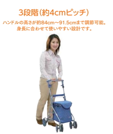| 商品の仕様 ●サイズ/幅46.5×奥行52×高さ84〜91.5(3段階/4cm)cm、折りたたみ時:奥行28×高さ64cm、座面:幅27×奥行23cm、座面高:48cm ●車輪/前輪13×後輪15cm ●重さ/4.4kg ●材質/ フレーム:アルミ(粉体塗装)、 バッグ: (ブラウン・ブルー)ビニールレザー (二筋格子ブルー・フローラルNB)ポリエステル ●バッグ容量/約14L ●積載荷重/10kg ●最大使用者体重/80kg ●標準機能/折りたたみ、2WAYキャスター(左右60°・固定)、手元ブレーキ、駐車ブレーキ、座面、杖・傘立て ●SGマーク取得商品 |