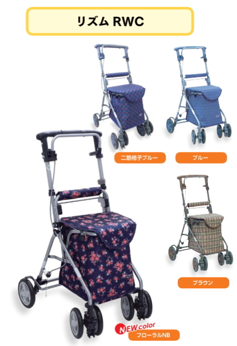 【送料について】北海道、沖縄、離島は別途送料を頂きます。リズムRWC / ブルー・アルミ車体の軽量タイプ。収納力+買い物カゴ置き付きで便利。・折りたたんでコンパクトに自立します。 ・ハンドル高さ84〜91.5cm・買い物カゴ積載可能・大容量収納バッグ採用・手元駐車ストッパーシステム ・最大使用者体重80Kg ・足元ゆったり ・高さ調節可能 ・折りたたみ可能でコンパクト収納 ・腰掛け可能 ・軽量アルミ製 ・手元ブレーキ付き商品の仕様●サイズ/幅46.5×奥行52×高さ84〜91.5(3段階/4cm)cm、折りたたみ時:奥行28×高さ64cm、座面:幅27×奥行23cm、座面高:48cm●車輪/前輪13×後輪15cm●重さ/4.4kg●材質/フレーム:アルミ(粉体塗装)、バッグ:(ブラウン・ブルー)ビニールレザー・(二筋格子ブルー・フローラルNB)ポリエステル●バッグ容量/約14L●積載荷重/10kg●最大使用者体重/80kg●標準機能/折りたたみ、2WAYキャスター(左右60°・固定)、手元ブレーキ、駐車ブレーキ、座面、杖・傘立て●SGマーク取得商品ご注意*この製品は、自立歩行出来る方がより安定して歩行できるよう補助的に使用するものです。
