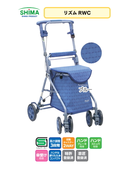 島製作所 リズムRWC ブルー お洒落なシルバーカー 大容量収納バッグ採用。収納力+買い物カゴ置き付きで便利。 SPL%OFF 高齢者 手押し車