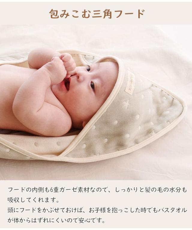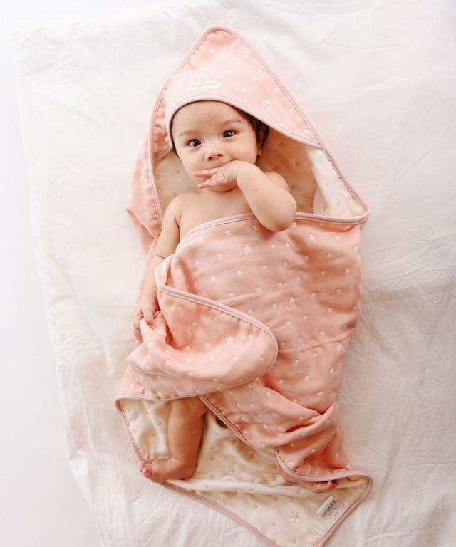 大判サイズ(約)80×80cmでお風呂あがりの赤ちゃんの体をすっぽりと包む