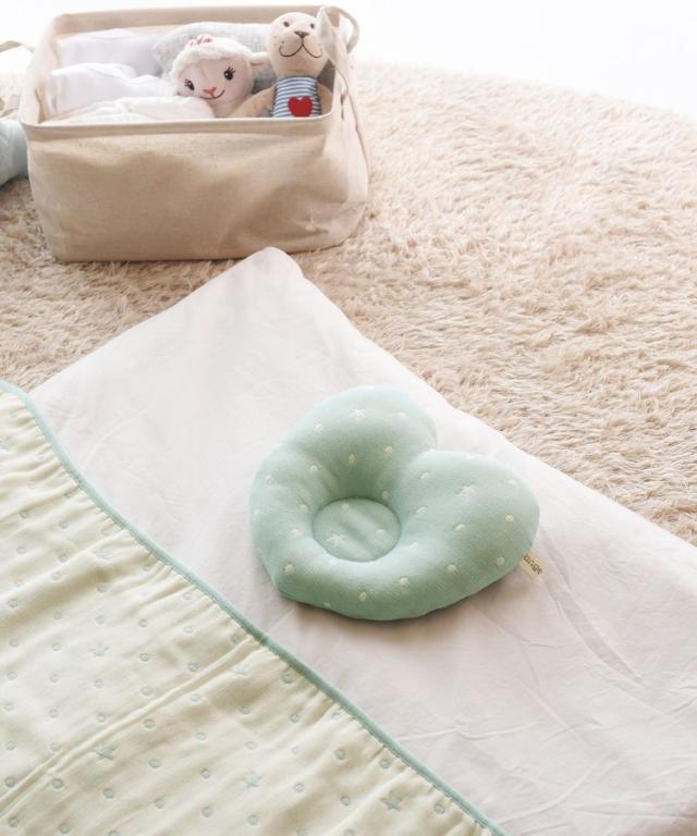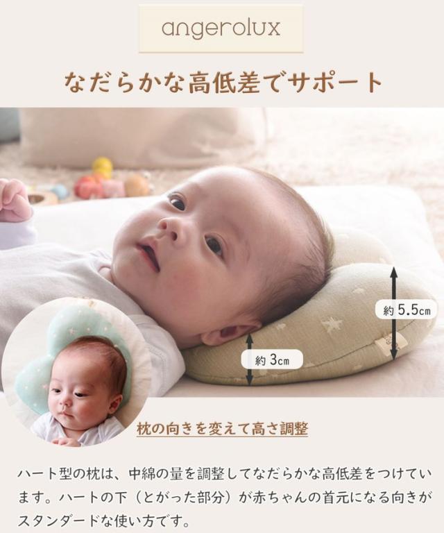 ハート型の枕は、中綿の量を調整してなだらかな高低差をつけています。ハートの下(とがった部分)が赤ちゃんの首元になる向きがスタンダードな使い方です。枕の向きを45度程度ずらして高さを調整して使うこともできます。ベビー枕だけでは高さが足りない場合には、タオルなどを使用して高さの調整をしてください。お子様の頭の形やサイズには個人差がありますので、お子様の様子をよく観察しながら、快適な高さを見つけてあげましょう。