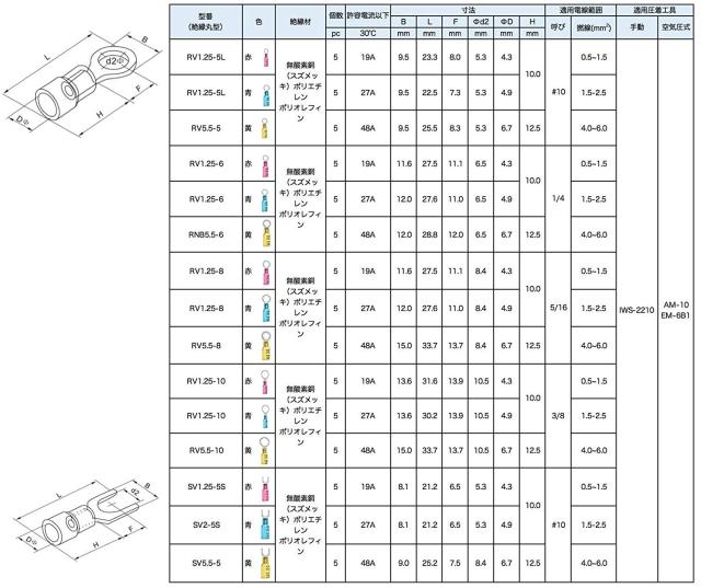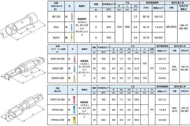 仕様:1.防水型ビニル絶縁付丸形端子、2.防水型ビニル・ナイロン絶縁付突き合わせ形接続子、3.防水型絶縁付差し込み型接続子、?絶縁付タブ・オン接続子
