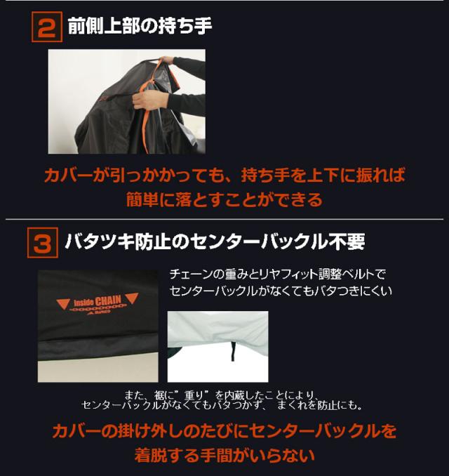 バタつきが少ないので、駐輪スペースが少なくても素早くかけられ、通常のカバーのおよそ半分の時間でかけられます。鎖の重みでカバーが広がりやすく、センターバックルがなくてもバタつかず、 めくれ防止にも。