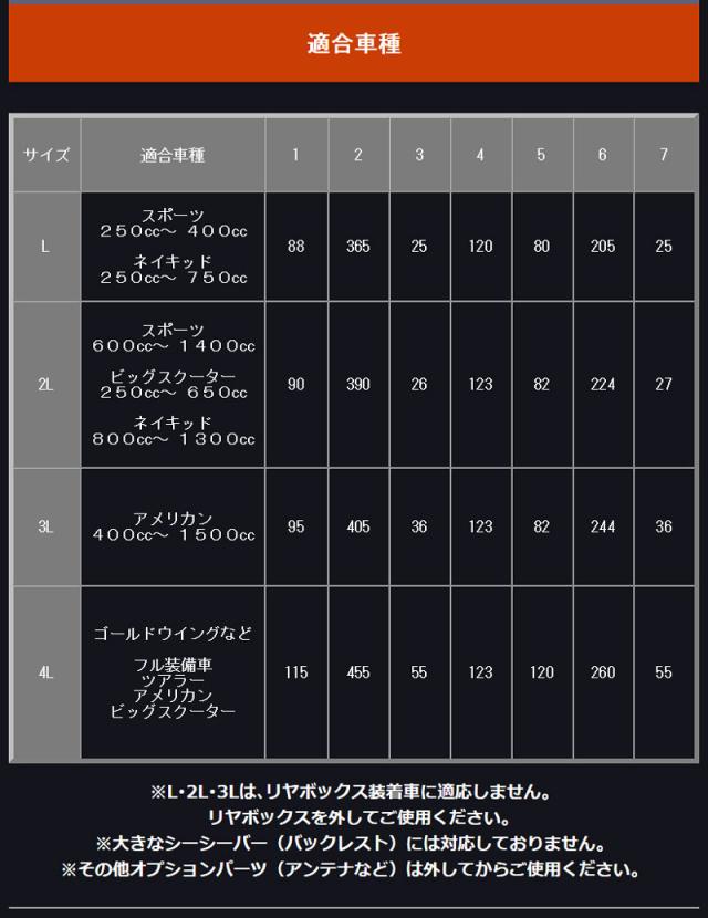 ※リヤボックス、バックレスト、シーシーバーには対応していません。
