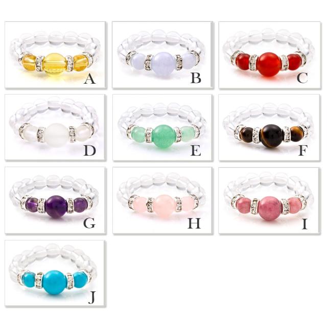 A : シトリン(熱処理石) 繁栄と富貴をもたらす幸福の石 B : ブルーレース アゲート ストレスを取り除いてくれる石 C : カーネリアン 積極性を高め未来を創造する石 D : フロスト水晶 あらゆる幸運を呼び寄せる万能石 E : アベンチュリン 平和と愛を象徴し、対人関係、家庭運のお守りに F : タイガーアイ あらゆる幸運と成功をもたらす、成功の石 G : アメジスト 愛の守護石、金運、家庭運のお守りに H : ローズクオーツ 愛と癒しをもたらす恋愛成就の石 I : ロードナイト 人生をバラ色に導く華やかな石 J : ターコイズ(トルコ石) 仕事運・積極性・魔除けに、幸運の石 ■注意事項■ 同じものでも色味・模様などが異なります。 傷・ヒビ・内包物などがある場合がございます。 天然石を加工して手作業で製作しておりますので、材質により玉の直径や重さ、内径など若干違いがございます。 商品画像はできる限り実物に近い色合いで掲載しておりますが、ご覧いただくモニター、 OS等の違いで画像と実商品の色合いが若干異なる場合がございます。 |