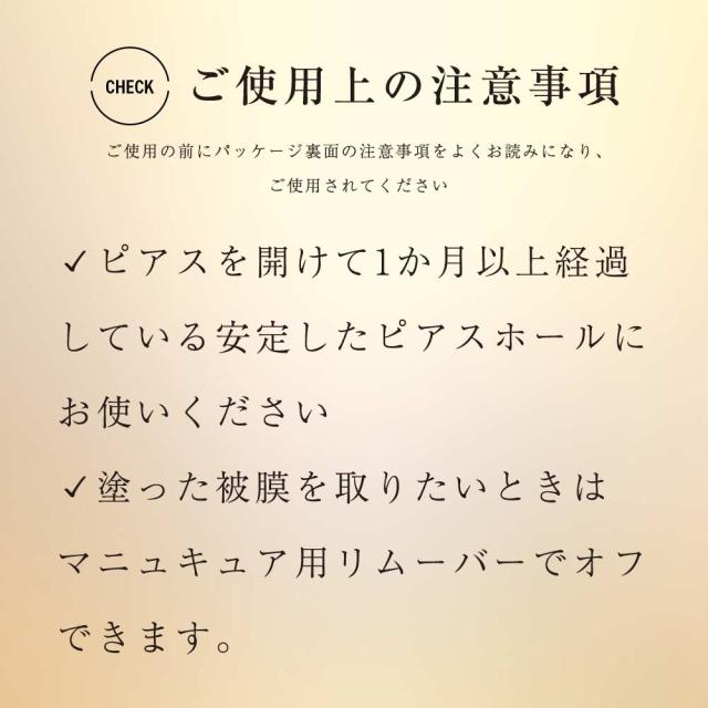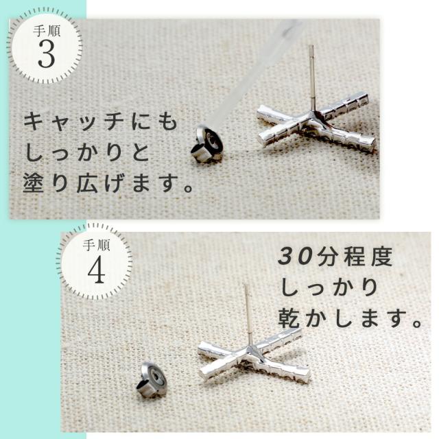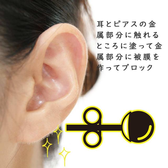 その後、ピアスホール内を含めて皮膚に触れる金属部分に塗り、20分くらい待って乾いてから装着します。