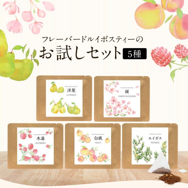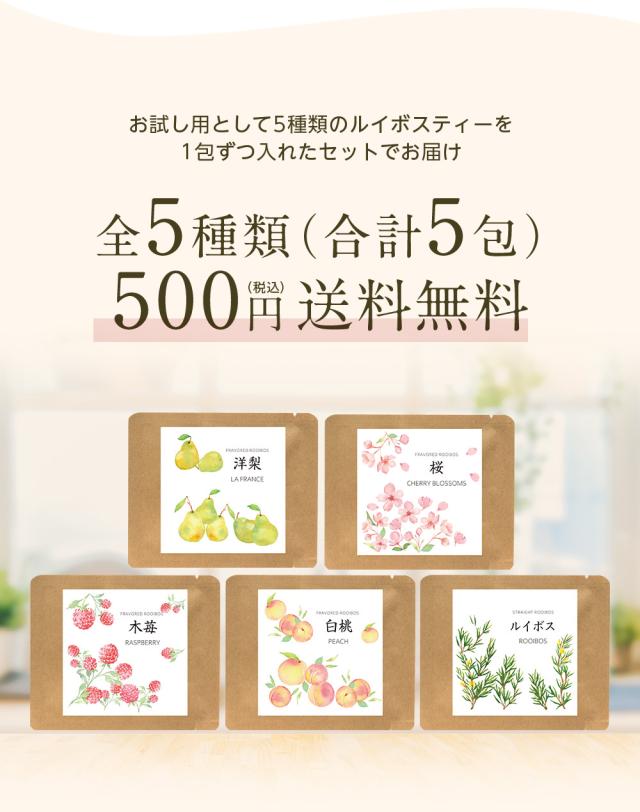 【特徴】4種類のフレーバードルイボスティーと通常のルイボスティーを試せる5パッケージセット。プチギフトにもおすすめです。【おすすめの飲み方】ポットにティーバッグを入れ、200〜400ccのお湯を注ぎ、3〜5分蒸らしてお召し上がりください。(蒸らし時間が長いほうが濃くでます)お湯の量はお好みで調整してください。【商品スペック】内容量:[洋梨]3g×1包・[桜]3g×1包・[木苺]3g×1包・[白桃]3g×1包・[ルイボス]2g×1包 計5包原材料:[洋梨]ルイボス(南アフリカ共和国)/香料、[桜]ルイボス(南アフリカ共和国)/香料、[木苺]ルイボス(南アフリカ共和国)/香料/ドライラズベリー、[白桃]ルイボス(南アフリカ共和国)/香料/ドライピーチ ※原材料に「桃」を含む[ルイボス]ルイボス(南アフリカ共和国)