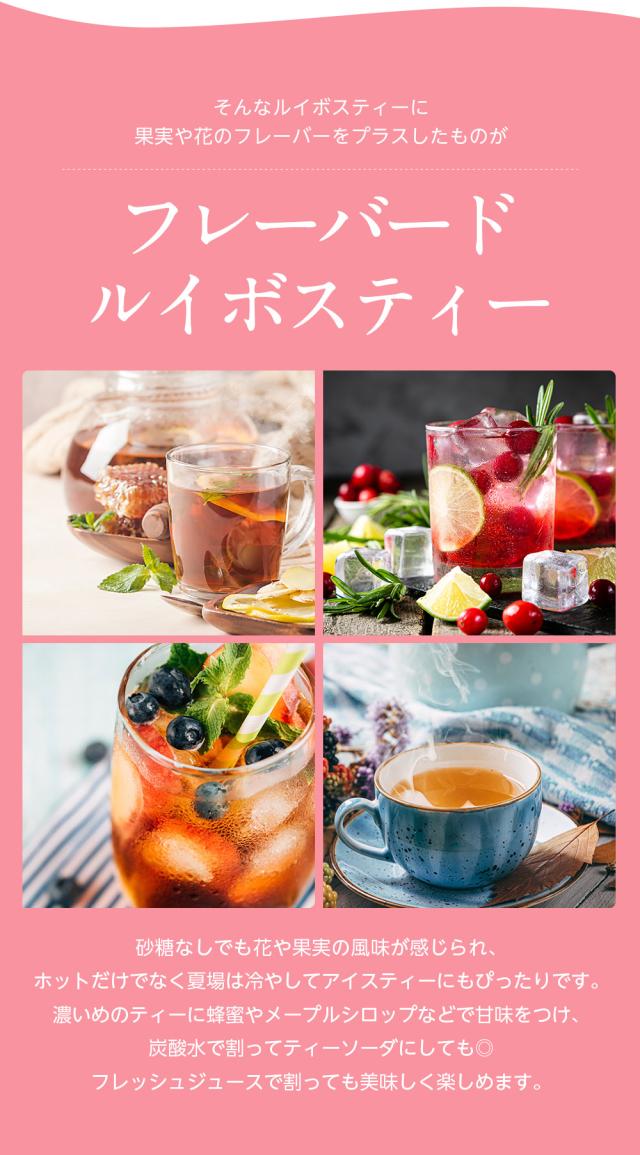 【原材料】[洋梨]ルイボス(南アフリカ共和国)/香料、[桜]ルイボス(南アフリカ共和国)/香料、[木苺]ルイボス(南アフリカ共和国)/香料/ドライラズベリー、[白桃]ルイボス(南アフリカ共和国)/香料/ドライピーチ ※原材料に「桃」を含む[ルイボス]ルイボス(南アフリカ共和国)