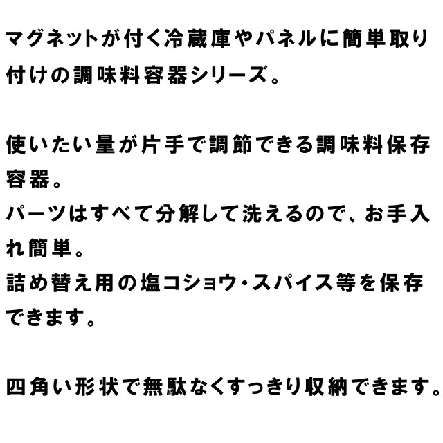マグネットが付く冷蔵庫やパネルに簡単取り付けの調味料容器シリーズ。 |