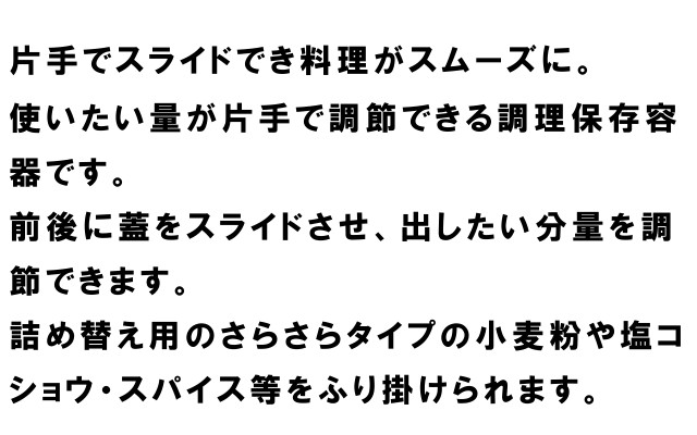 詰め替え用のさらさらタイプの小麦粉や塩コショウ・スパイス等を保存できます。