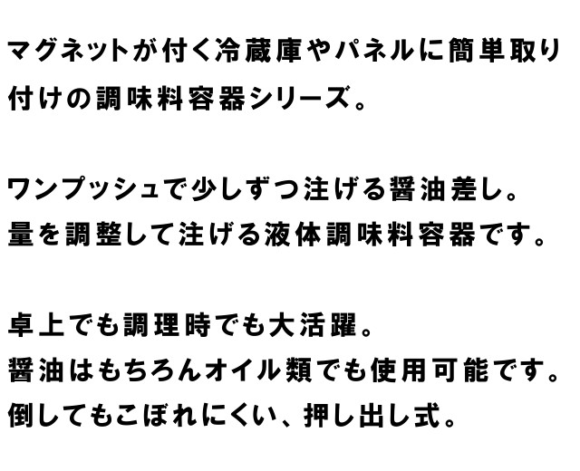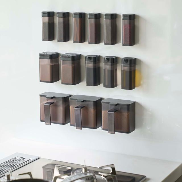 マグネットが付く冷蔵庫やパネルに簡単取り付けの調味料容器シリーズ。 |