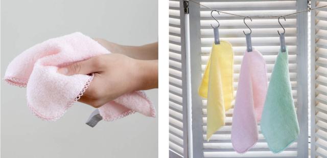 | 素早くたくさん吸収する 高品質の綿を使用し、糸の捻りに独自の技法を加えることで、糸と糸の間に隙間が多くでき、水をたくさん含んでくれるので、吸水性と吸水スピードが抜群です。汗や水分をすぐにしっかり吸収するので、肌の負担を軽減したり、時間の節約にもなります。 | 乾きが早い エアーフィーリング糸を使用しているため繊維の隙間が多く、脱水した後の水分量が少ないので早く乾きます。 |