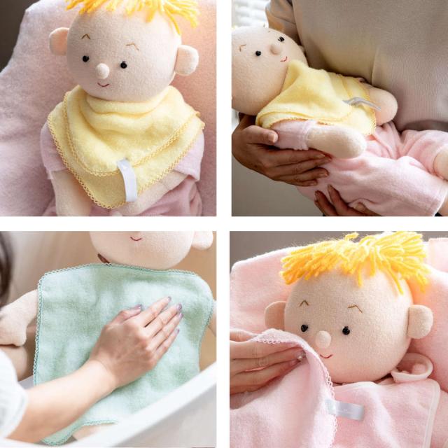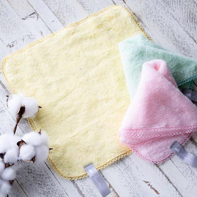 ハンカチとしてはもちろん、赤ちゃんの沐浴用のタオルやスタイの代わりになど、赤ちゃんとの生活の様々な場面でお使いいただけます。縁取りが施された可愛いデザインで、使いやすいサイズ感です。