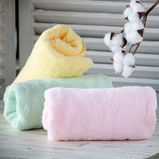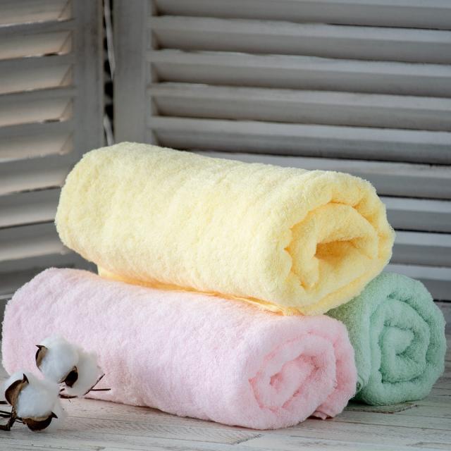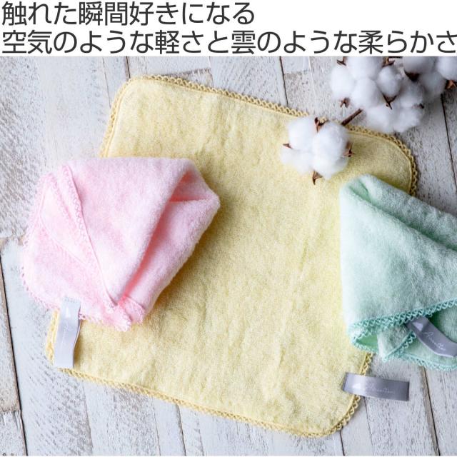 高級極細綿糸を特殊加工し(エアーフィーリング糸)、たっぷり空気をふくんで、雲のように柔らかく仕上げています。卵を上から落としても割れない柔らかさで、赤ちゃんが初めて触れるタオルとして、また敏感肌の人にもピッタリです。