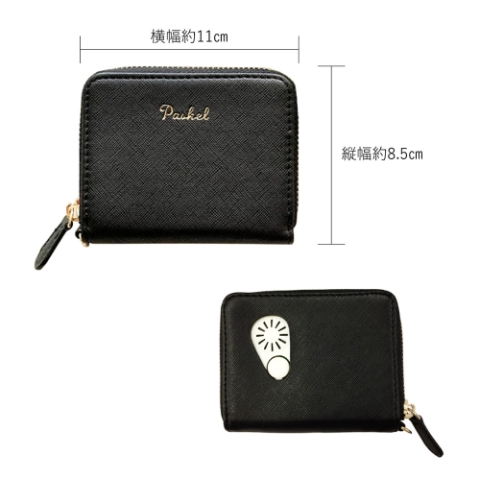 ラウンドファスナー式開閉・内側:カードポケット×1・スナップボタン小物入れ×1・ブザーポケット×1・背面:防犯ブザーボタン