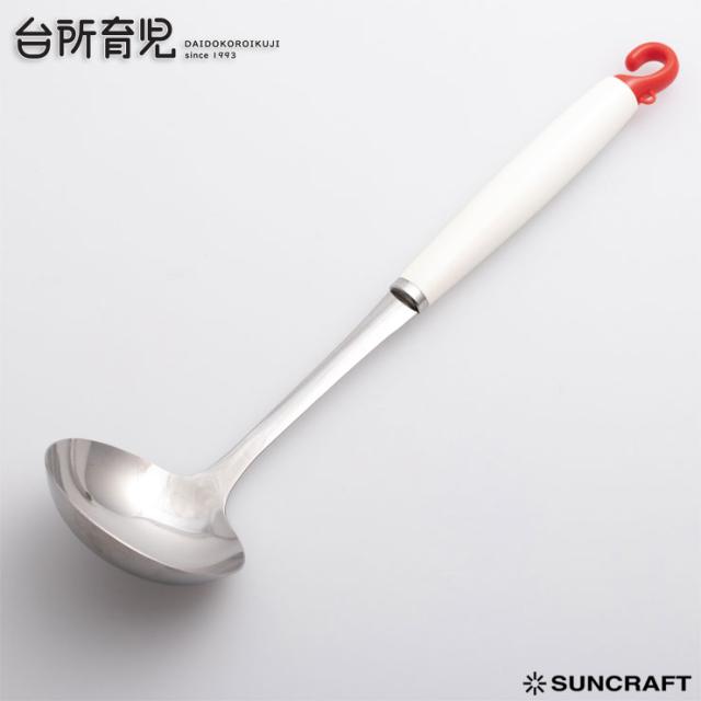 軽くて使いやすい小さなサイズのお玉。ハンドルが長いので、熱源から遠い状態で安全に使えます。