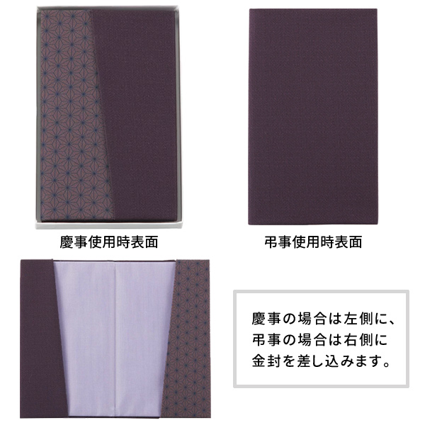 金封の包み方は慶事と弔事で異なります。このふくさは慶事の右包みと弔事の左包みをもとに考案された金封ふくさです。※右開きで慶弔両方使用することができます。