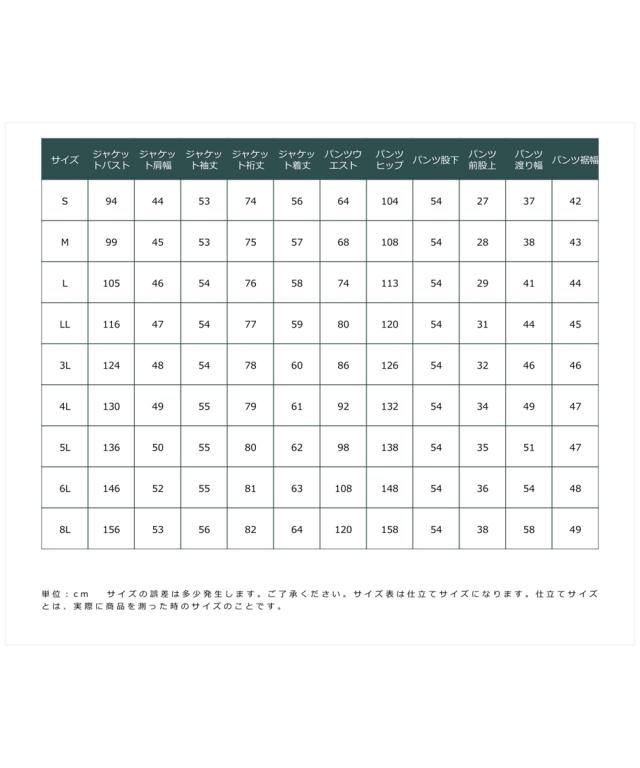 品質=[表地]ポリエステル100%(織物綾二重織) 【裏地】有(ジャケット:総裏 パンツ:無) ジャケット:肩パッド無 ポケット前2 胸当て付 袖口スリット パンツ:ウエスト脇・後ゴム入 ポケット両脇 ※この商品は2点同サイズのみで販売します。※胸当ては取り外し出来ます中国製(企画デザインは日本)洗濯機OK ネット使用