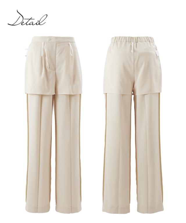 品質=[表地]ポリエステル95%・ポリウレタン5%(織物 ストレッチ変り織) [裏地]ポリエステル100% [裏地]有(ヒップ部 ストレッチ裏地使用) 前ホック内ボタン付ファスナー開 ウエスト後ゴム入 ポケット両脇・後飾り ※淡色は透け感がございますので、ベージュ系の下着のご着用をお勧めします。 原産国:中国製 洗濯表示:洗濯機OK ネット使用