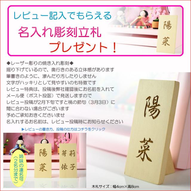 - コンパクトな雛人形をお祝いにしようと探していました。 パッとでてきた、商品に一目惚れ。 即決しました。 早く入荷するといいなぁー。 特典の名前札も楽しみです。(取引No.574594228) 名前は『...