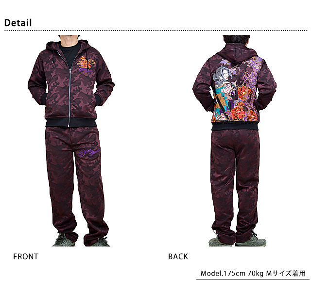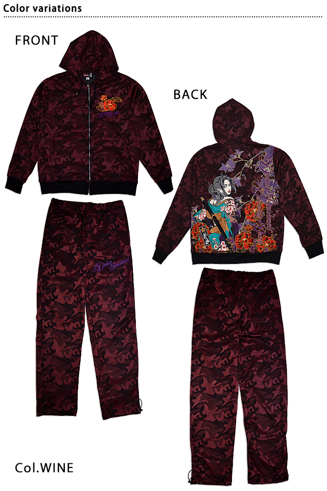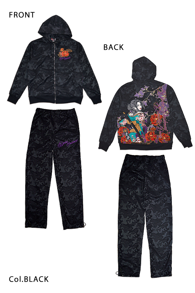 絡繰魂の姉妹ブランドとして誕生した、従来の和柄から抜け出し、和の持つ美しさを融合させた【抜刀娘】から「抜刀娘 穂乃花セットアップ(221068)」のご紹介です。 今年もヘビロテ間違いなしの抜刀娘のセットアップが登場! 今回モチーフの主役に採用されたのは、美しい穂乃花。 トップスはジップアップパーカー。 パンツはウエストにゴムが通されたイージーパンツデザイン。 | ||||||||||||||||||||||||||||||||||||||||||||||||||