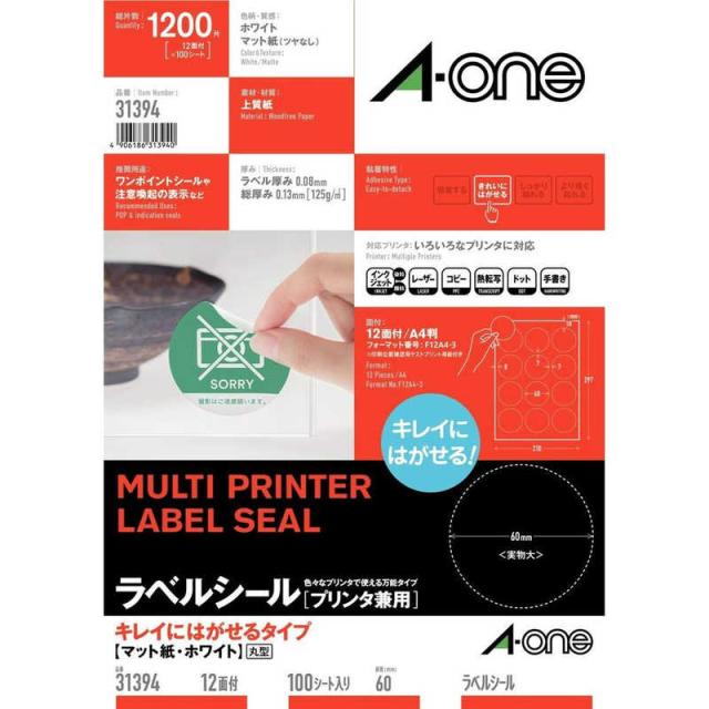 エーワン ラベルシール[プリンタ兼用]キレイにはがせるマット紙・ホワイト 12面 丸型 100入 31394 ホワイト [100枚~/A4]