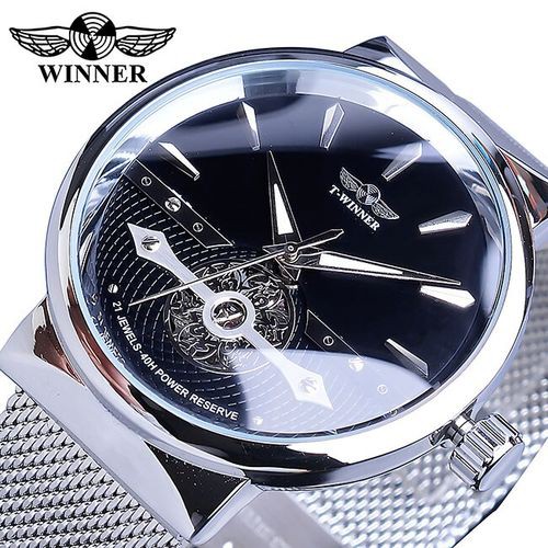 WINNER メンズメカニカルウォッチビジネススリムホローブラック自動巻き防水スチールメッシュ GMT1135-6Small