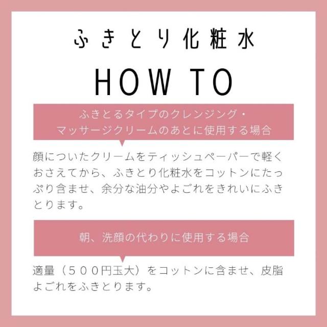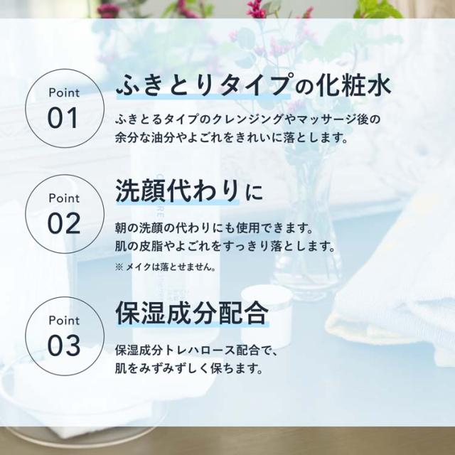 ●(ふきとり専用の化粧水)クレンジングやマッサージ後の余分な油分を溶かしながら落とす、拭き取り化粧水。肌に負担をかけずに、すっきりと拭き取れます。