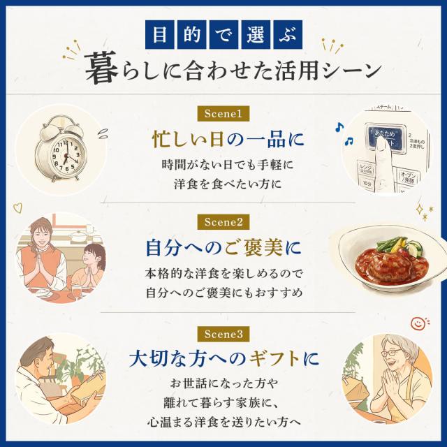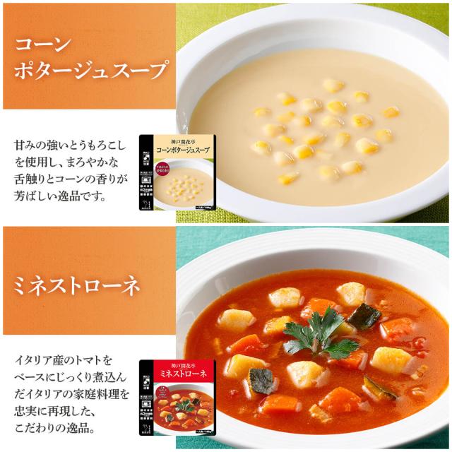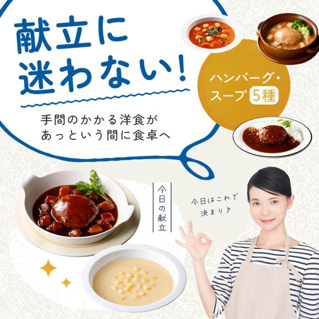 | 内容量 | カレーハンバーグ 190g シチューハンバーグ 190g クリームシチューハンバーグ 190g コーンポタージュスープ 180g ミネストローネ 180g 5種 各2食 合計10食 |