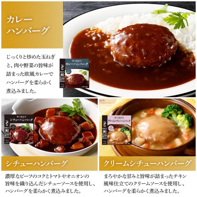 ![]() 煮込みハンバーグ・シチュー 5種10食セット | ![]() ハンバーグ 6種12食セット | ![]() カレー・シチュー・スープ 6種12食セット | ![]() 神戸開花亭 選べる10食 |