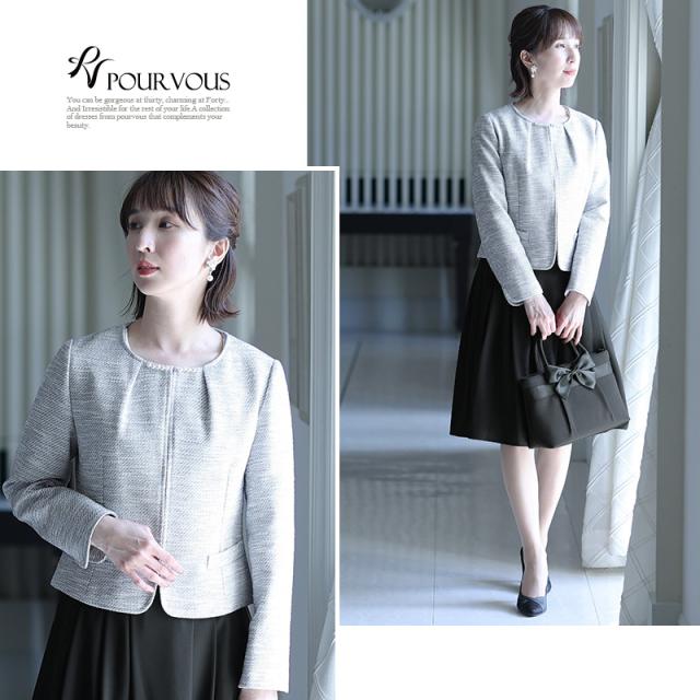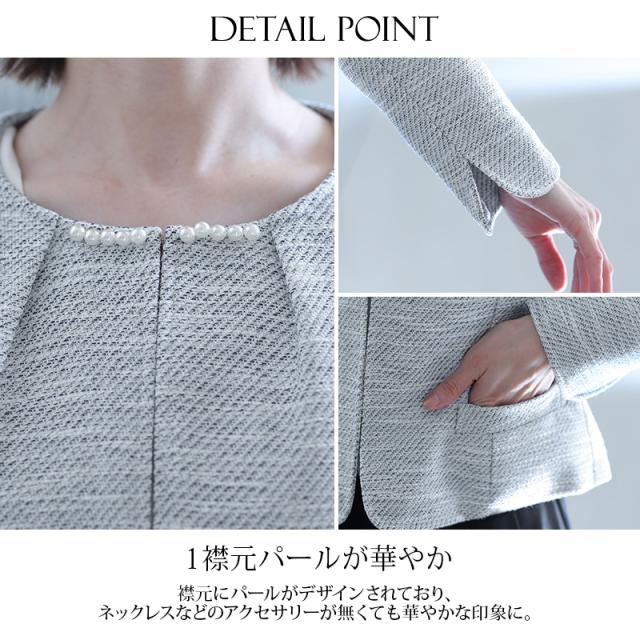 胸元パールノーカラージャケットスーツ【715211910】20代・30代・40代・50代長袖・膝丈・セットアップ・バイカラー・体型カバー・ジャケット・テーラード・スーツ・大きいサイズなど・即日発送・送料無料結婚式・婚活・披露宴・顔合わせ・二次会・同窓会・お呼ばれ・食事会・謝恩会・親族・七五三・お宮参り・冠婚葬祭・弔事・女子会・デート・入学式・卒業式・入園式・卒園式・ママ・マタニティー・セレモニー・セレブ・パーティー