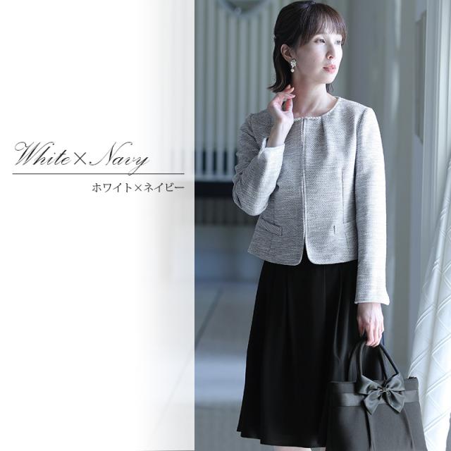 ■素材:【ジャケット】ネイビー 表地:ポリエステル90%・レーヨン10%/ホワイト×ネイビー 表地:ポリエステル100%・綿30%【スカート】ポリエステル95% ポリウレタン5%【裏地】ポリエステル100%